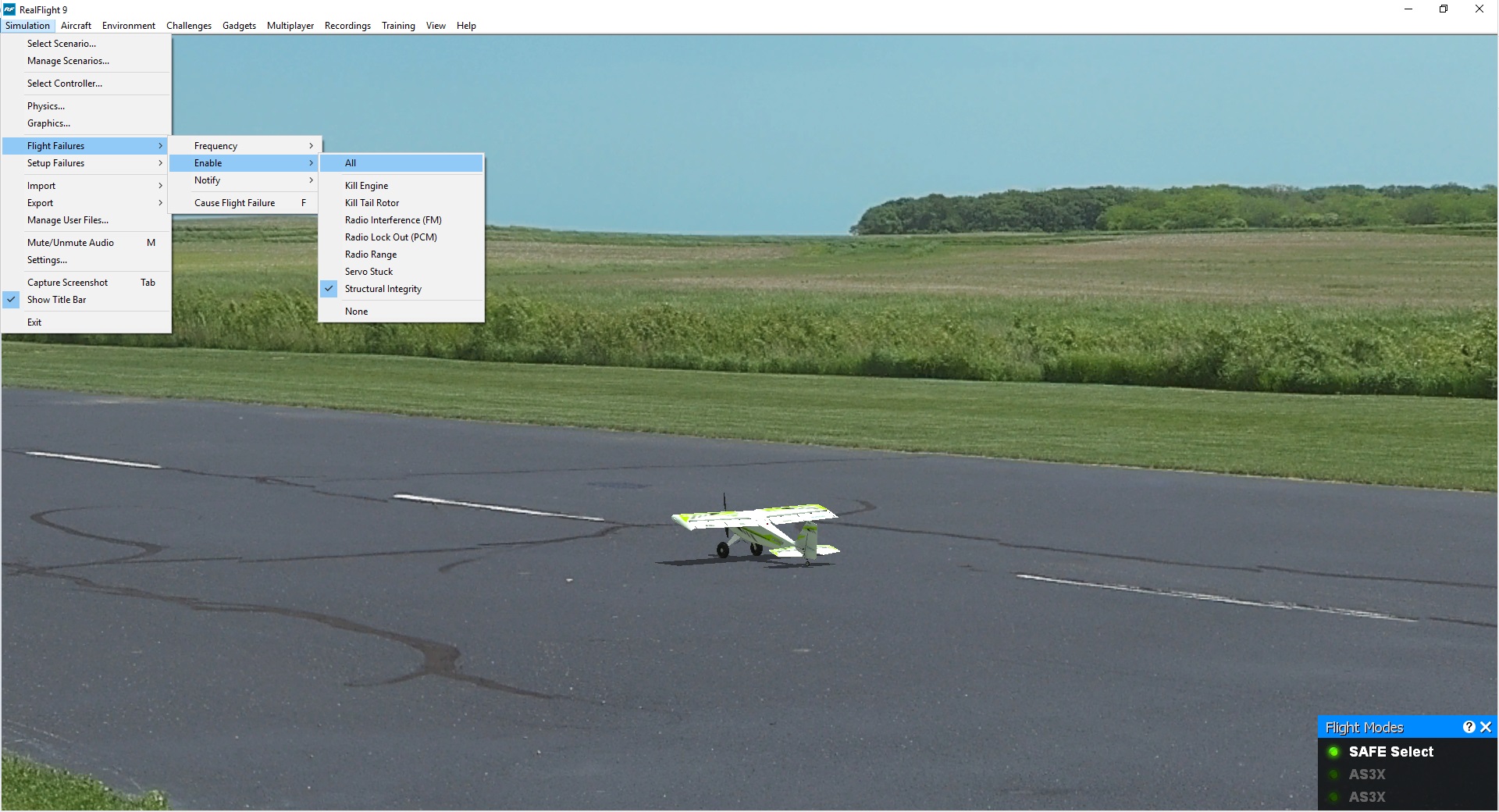 Flight Failures - možné závady při letu (zhasnutí motoru, interference signálu,…) - lze nastavit frekvenci výskytu závada, typ závad, upozornění na závadu a písmenem F lze během letu závadu vyvolat