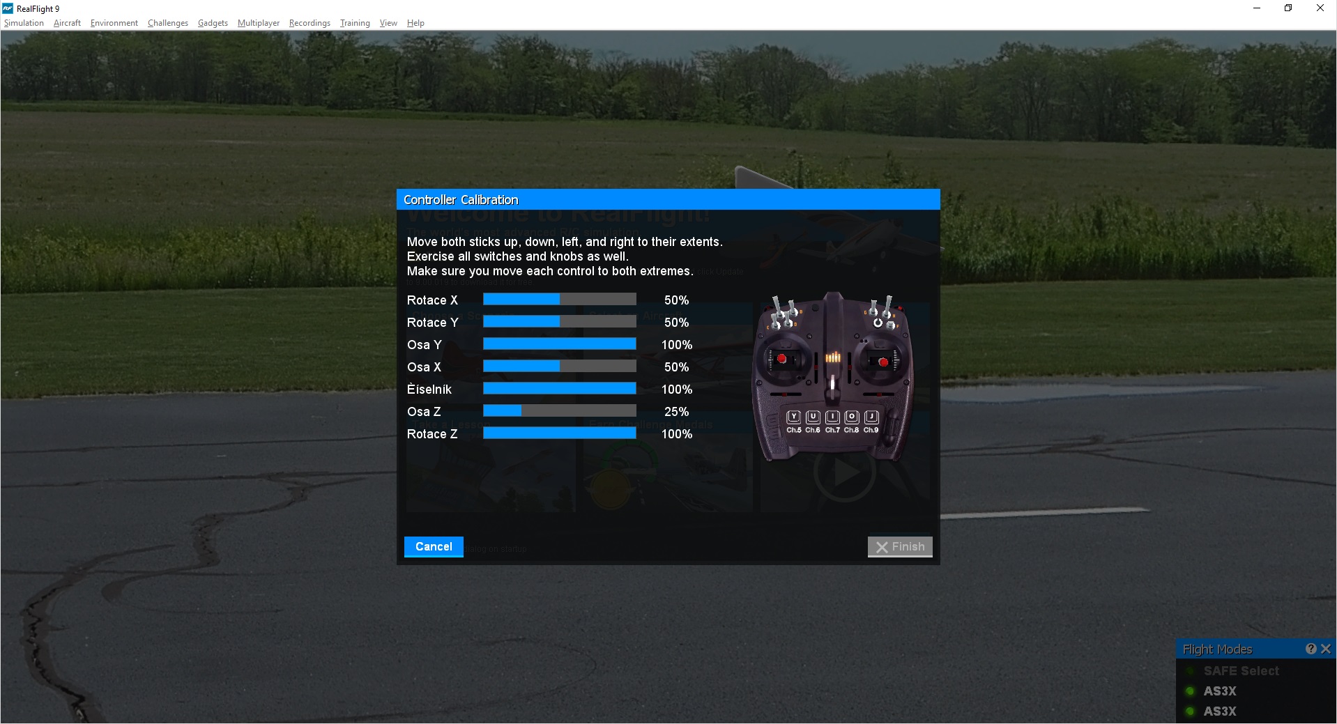 Po zapnutí budete vyzvání ke kalibraci připojeného ovladače. V prvním kroku je nutné uvést všechny přepínače do zaklání polohy, křížové ovladače do středu a pokračujte tlačítkem NEXT. V druhém kroku postupně uveďte všechny přepínače, včetně křížových ovladačů, do krajních poloh. Kalibraci ukončíte tlačítkem FINISH.