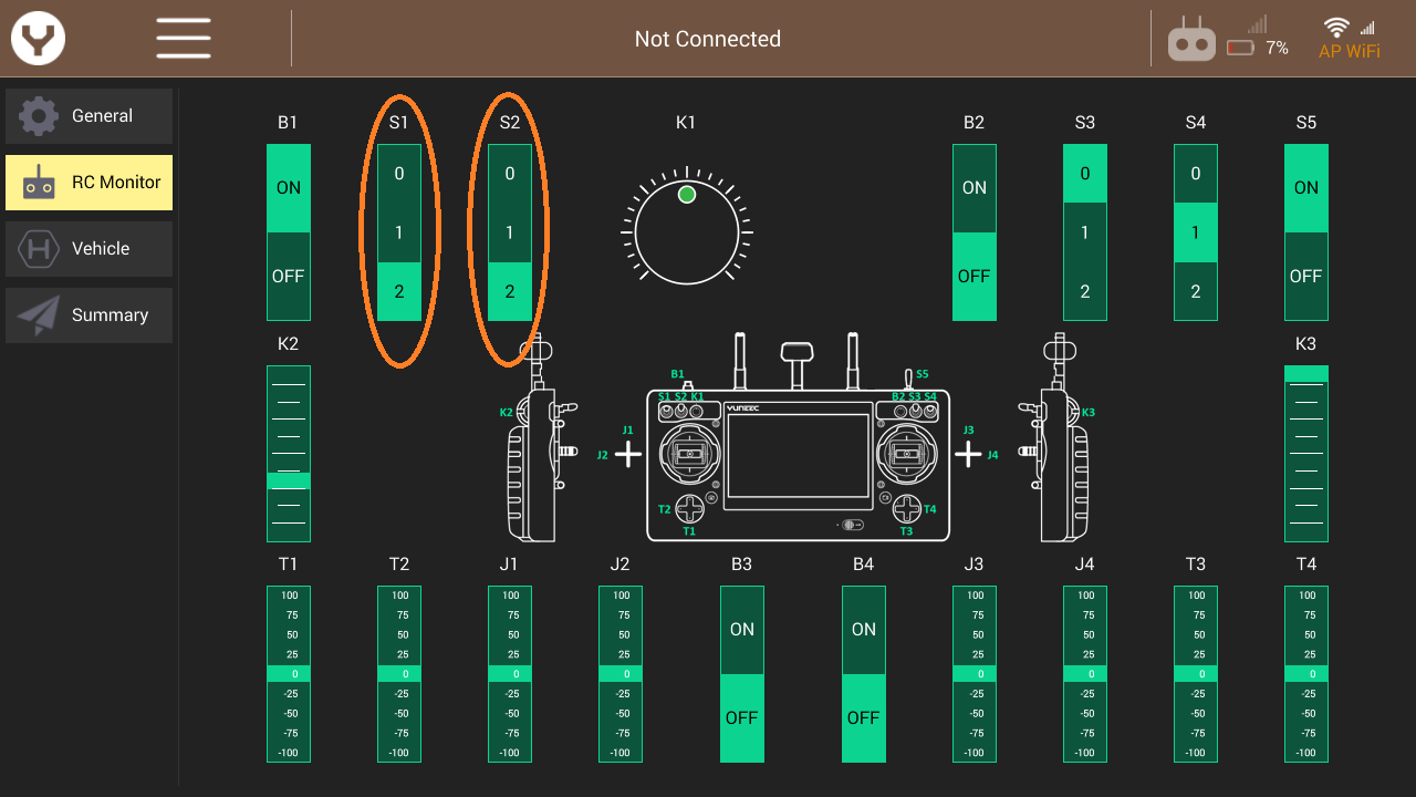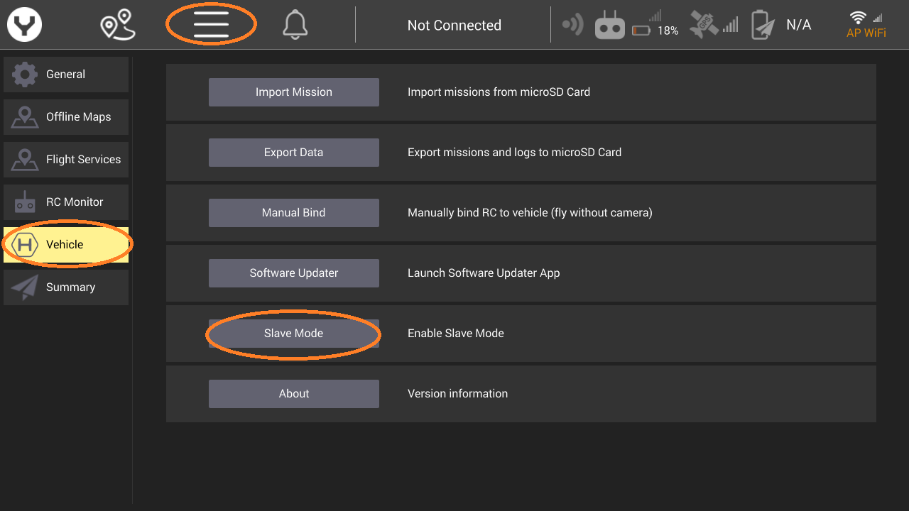 - V aplikaci DataPilot (aplikace naběhne po zapnutí vysílače) klikněte na iconu Menu, vyberte odrážku Vehicle a poté Slave Mode.
