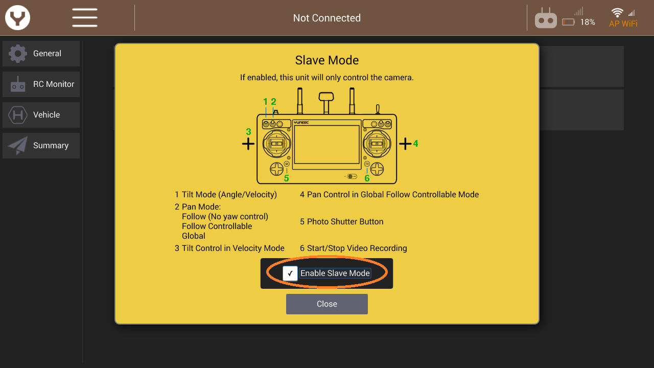 Pro deaktivaci Teamového režimu stačí vypnout dron a na vysílači Slave zrušit Checkbox Team mode. Poté obě vysílačky vypněte.