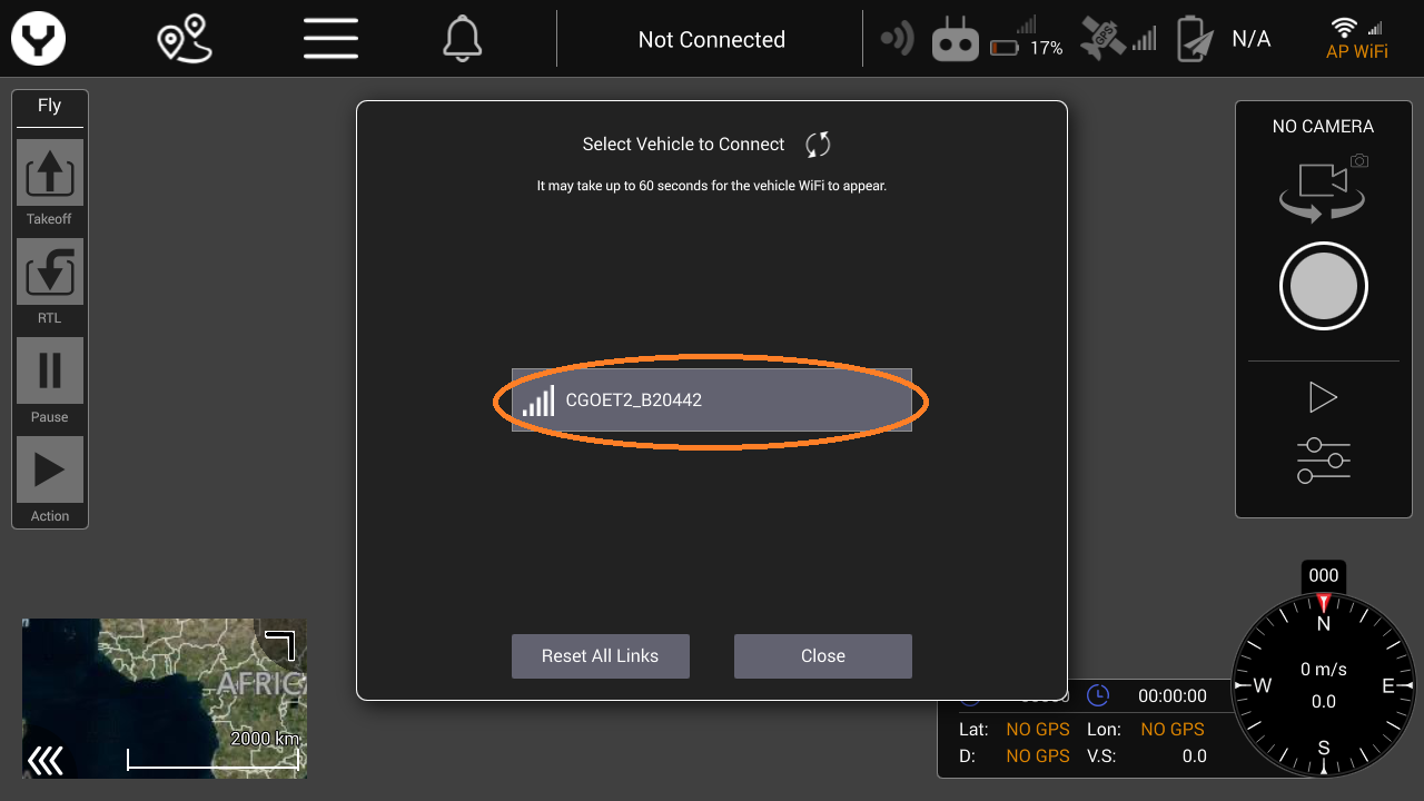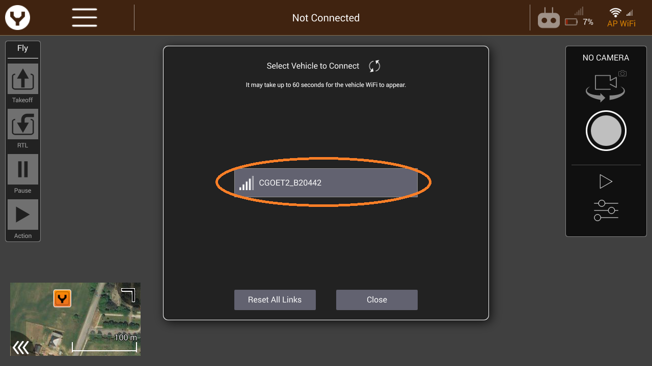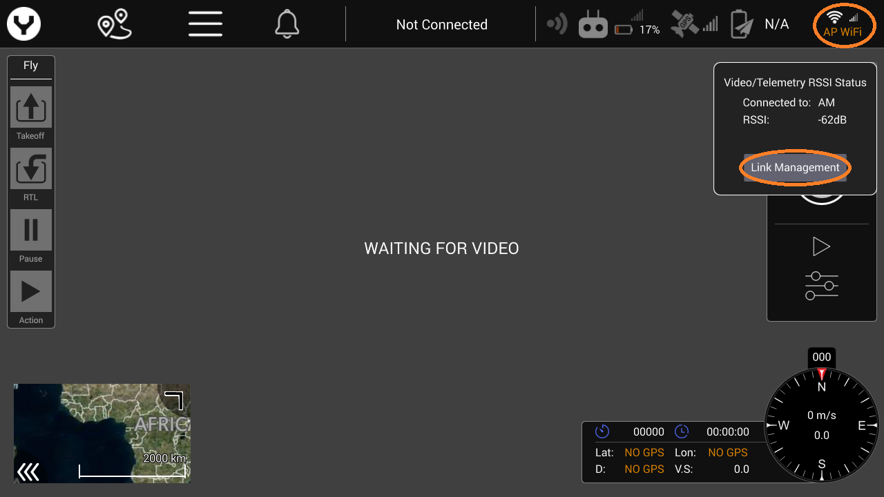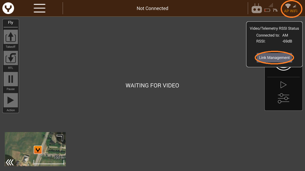 - Spárujte kameru s vysílačem kliknutím na ikonu wifi a poté na Link Management, kde po chvíli naběhne aktuální kamera na dronu, kterou potvrdíte.