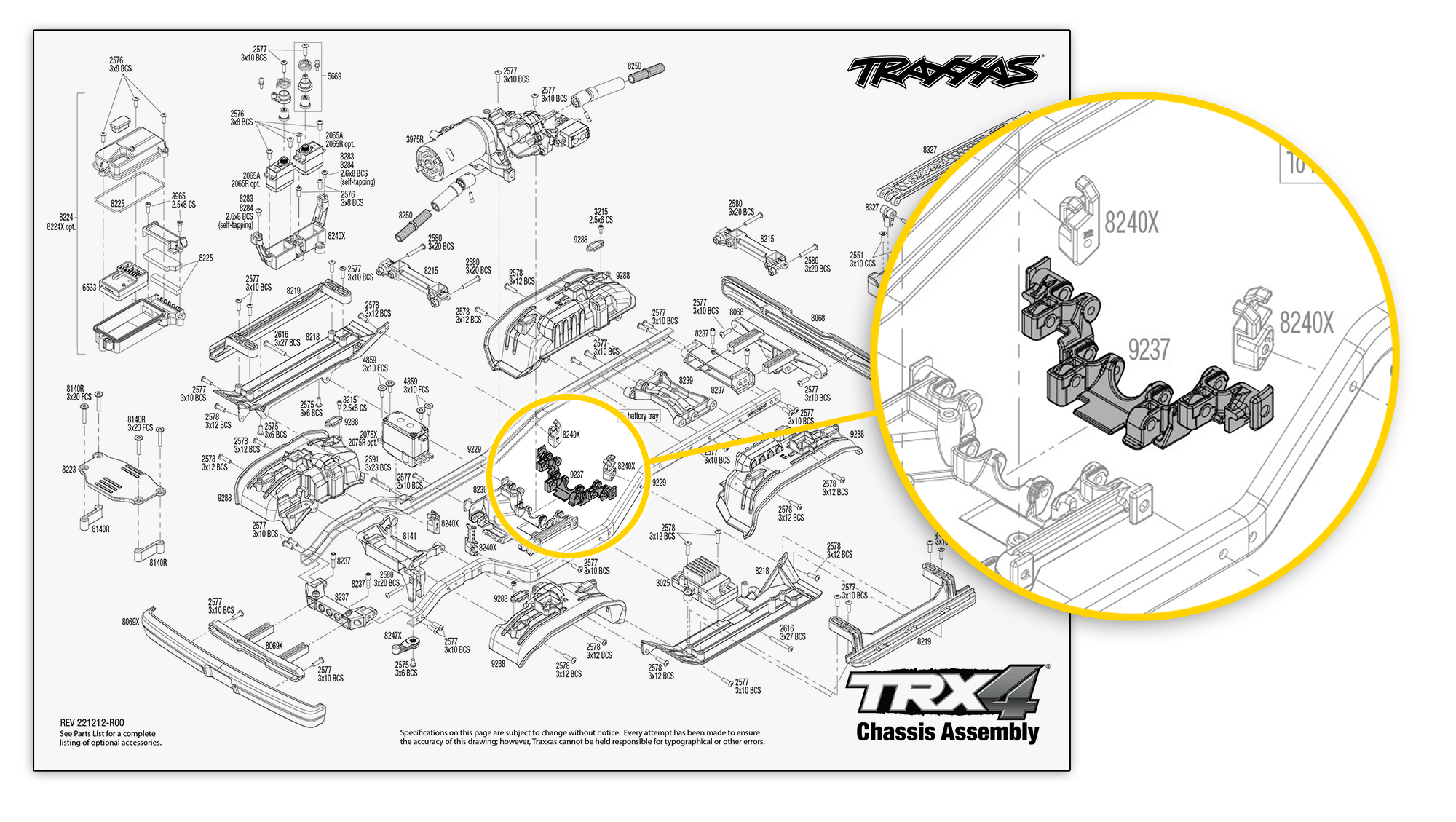 Pokud máte model TRX-4 s rozvorem 312 mm (Chevrolet Blazer 1979, Ford Bronco 1979, nebo Mercedes-Benz G500), budete muset nainstalovat delší zadní táhla a prodloužit zadní středovou hnací hřídel (k tomu slouží konverzní sada z kratšího na delší rozvor 324 mm). Modely TRX-4 s delším rozvorem 324 mm (Land Rover Defender nebo Ford Bronco 2021) mohou využívat všechny své stávající díly zavěšení a hnacího ústrojí. Pak již jen stačí instalovat následující komponenty:
