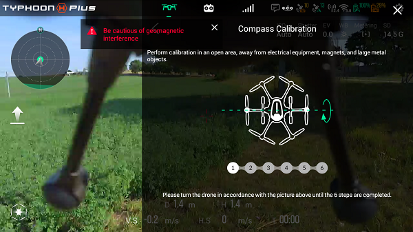 Kalibrace kompasu je nyní přehledně znázorněna v aplikaci. Probíhá standartním procesem uchopení za protilehlá ramena a přetáčením dronu od sebe. H Plus Vás již upozorní zvukovým signálem, že můžete změnit uchopení ramen a pokračovat dále v dalším kroku kalibrace.