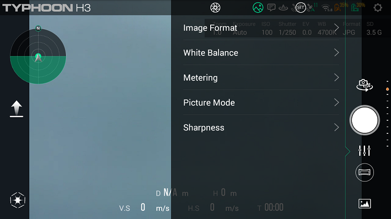 V nastavení snímku můžete měnit Formát obrázku, Vyvážení bílé, Ostření, Mód snímku, Ostrost.