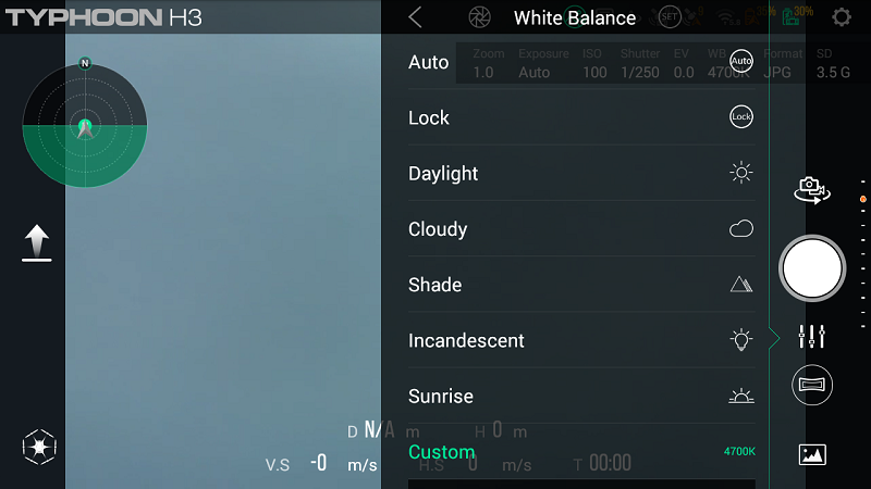 Pro každý typ prostředí s různými světelnými podmínkami jsou určeny režimy Auto, Lock, Daylight, Cloudy, Shade, Incandescent, Sunrise nebo ruční uživatelské nastavení teploty barev.