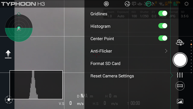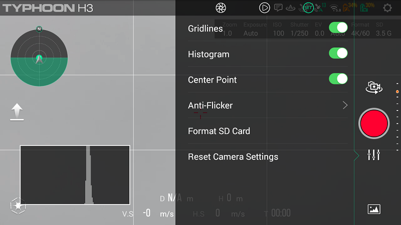 Další nastavení opět umožňuje zobrazení mřížky na monitoru (Gridlines), profesionálního Histogramu, středového kříže (Center Point). Dále můžete nastavit Anti-flicker (50, 60Hz - proti blikání obrazu), formátovat SD kartu, nebo provést reset kamery na základní hodnoty.