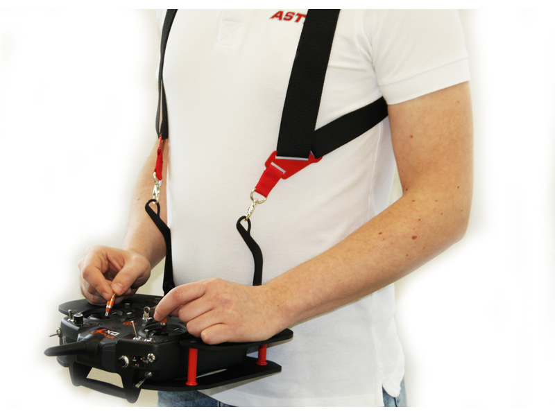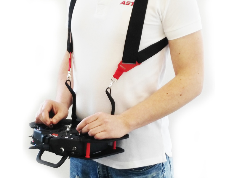 Kvalitní křížový popruh vysílače s logem Astra je z pevného materiálu, má nastavitelnou délku popruhů a poutací karabiny pro upevnění k pultu.