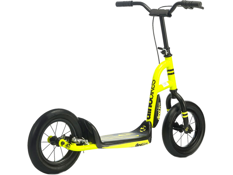 Dětská designová koloběžka DINO Bikes ve žluté barvě. Vhodná na všechny povrchy. Pohodlné 12" kola se vzduchem plněnými plášti, pevný rám, zadní čelisťová brzda, protiskluzová nášlapná deska, nastavitelná řídítka, přední blatník.