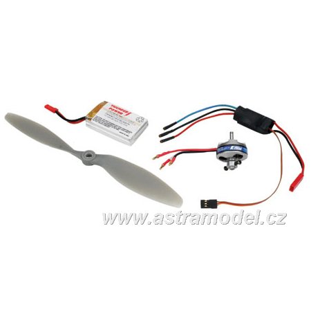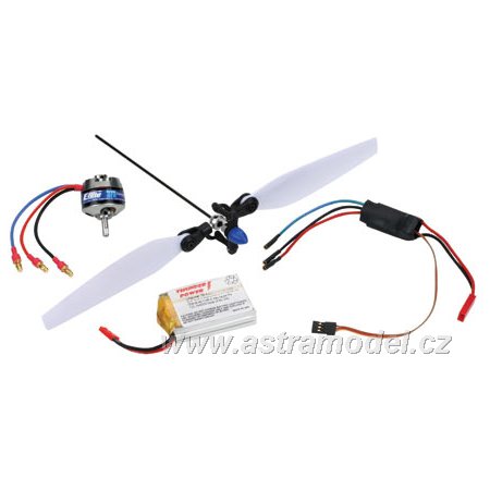6 kanálový vysílač (s mixy a dvojími výchylkami), mikropřijímač, 4 sub-mikro serva, motor, 10A střídavý regulátor, APC vrtule 8x3.8 Slow Flyer, baterie s nabíječem