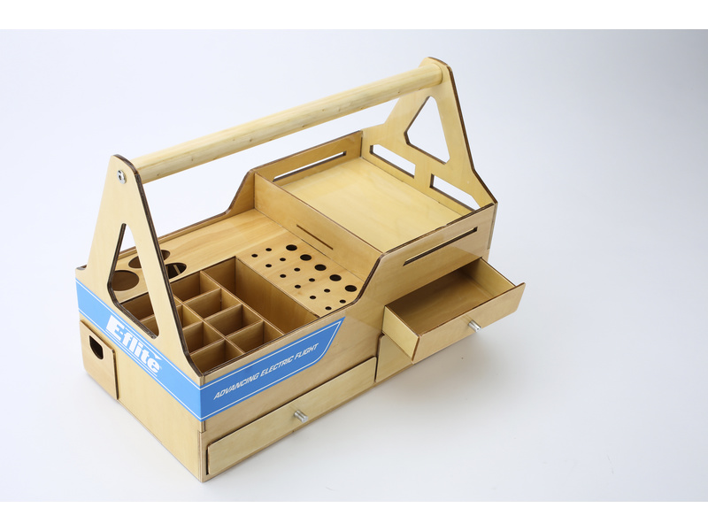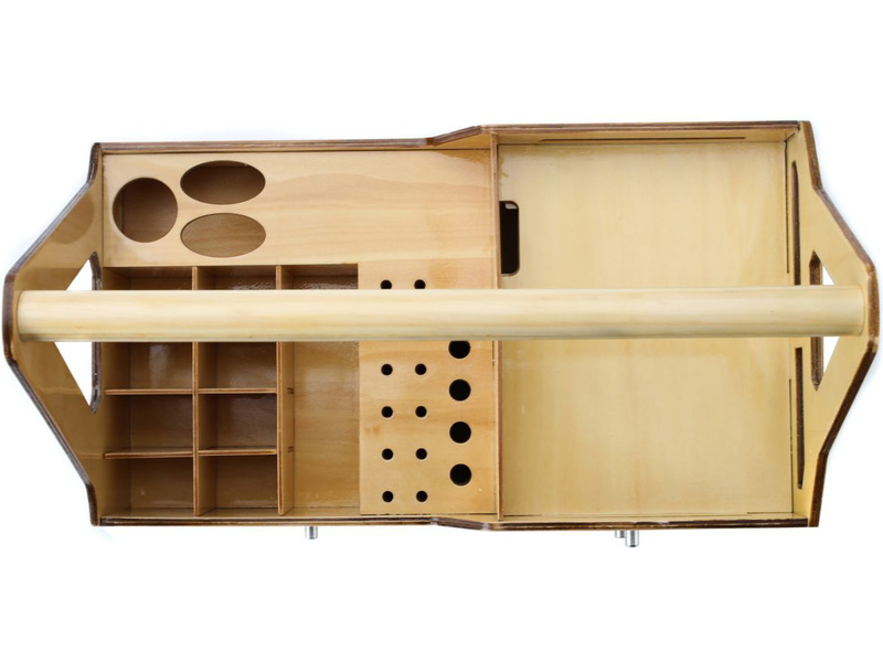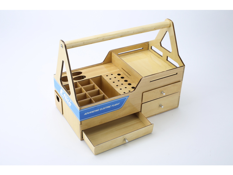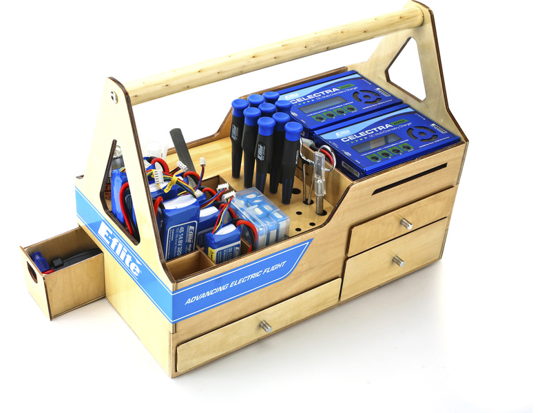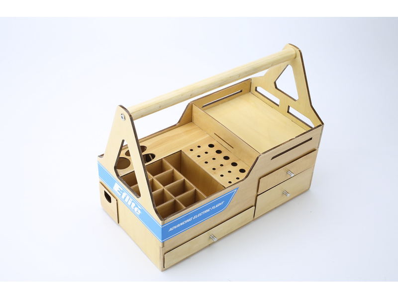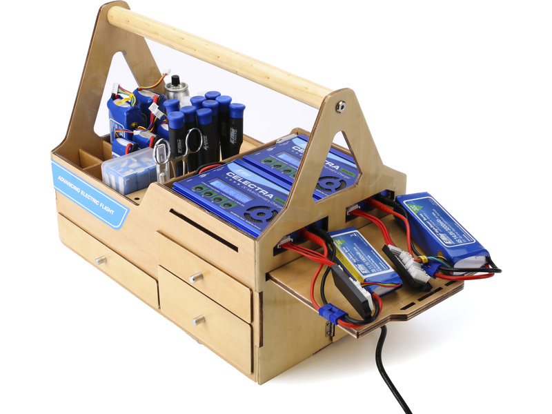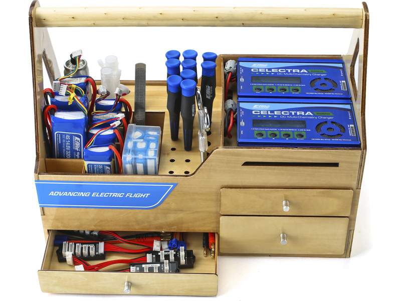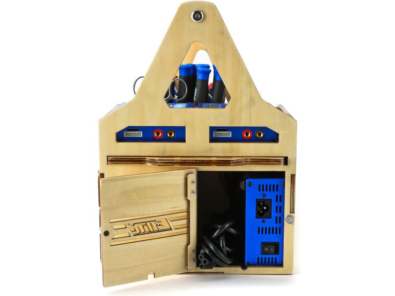 Velmi dobře promyšlený a navržený Elektrobox pro příslušenství k elektropohonu, jako jsou baterie, nabíječe nářadí apod. Je vyroben z kvalitní překližky, má pevnou konstrukci, kvalitní lakované díly pro dlouhou životnost a hliníkové úchytky zásuvek.