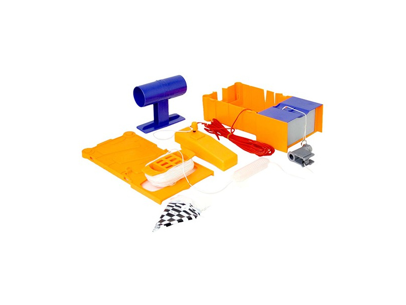 Set obsahuje startovací box, odpalovací zařízení, model dragsteru, vodící šňůru a padák.