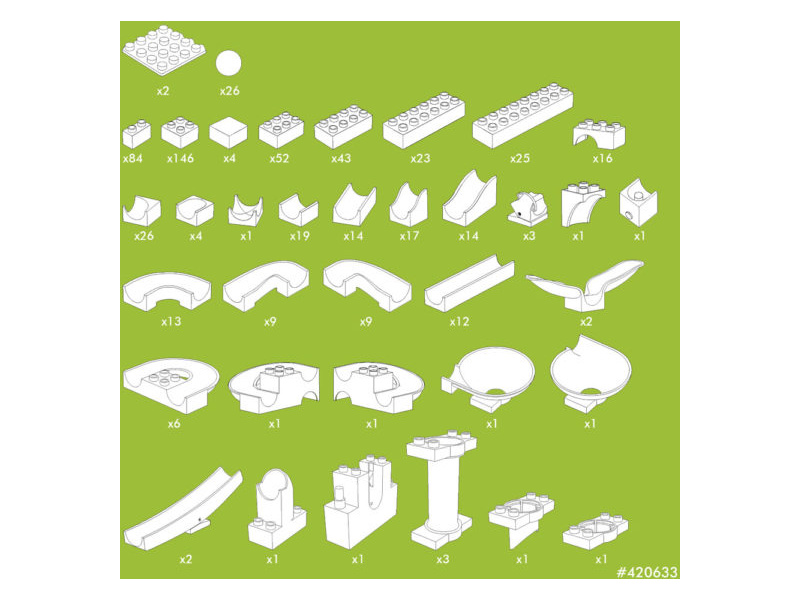 Set Mega obsahuje: 585 dílků (162 prvků dráhy, 377 stavebních kostek, 18 speciálních prvků, 2 základní desky, 26 kuliček) + obrázkový návod na sestavení varianty A1, B1 a C1.