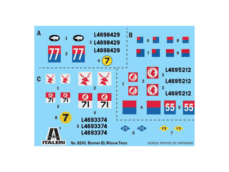 Plastikový model Italeri 0241 - Bedford QL Truck v měřítku 1:35 ke slepení. Délka modelu 171 mm, obtížnost 3. Balení obsahuje SKVĚLÉ OBTISKY PRO 3 VERZE.