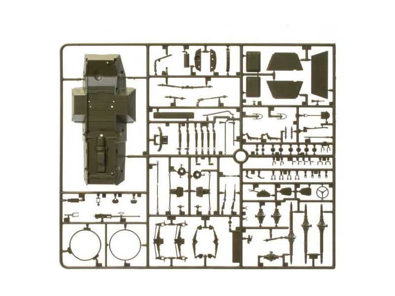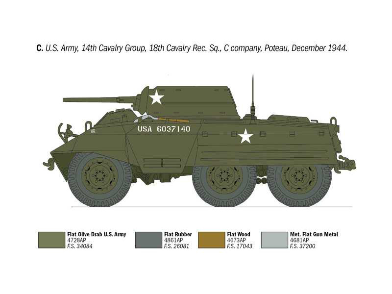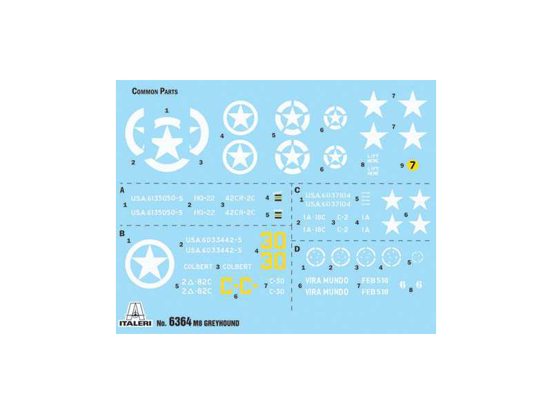 Plastikový model Italeri 6364 - tank M-8 Greyhound v měřítku 1:35 ke slepení. Obtížnost 3. Balení obsahuje SKVĚLÉ OBTISKY PRO 4 VERZE.