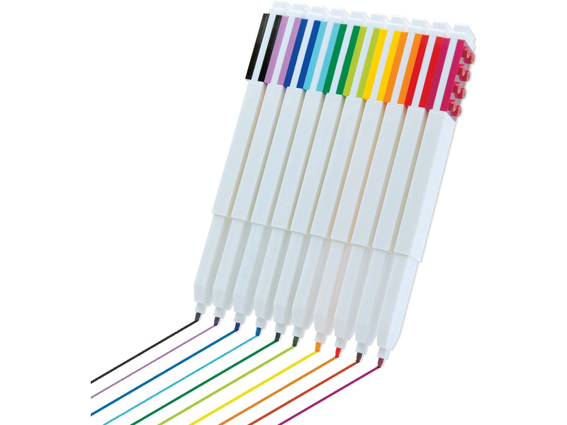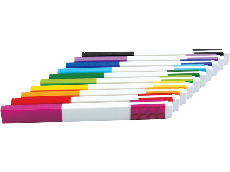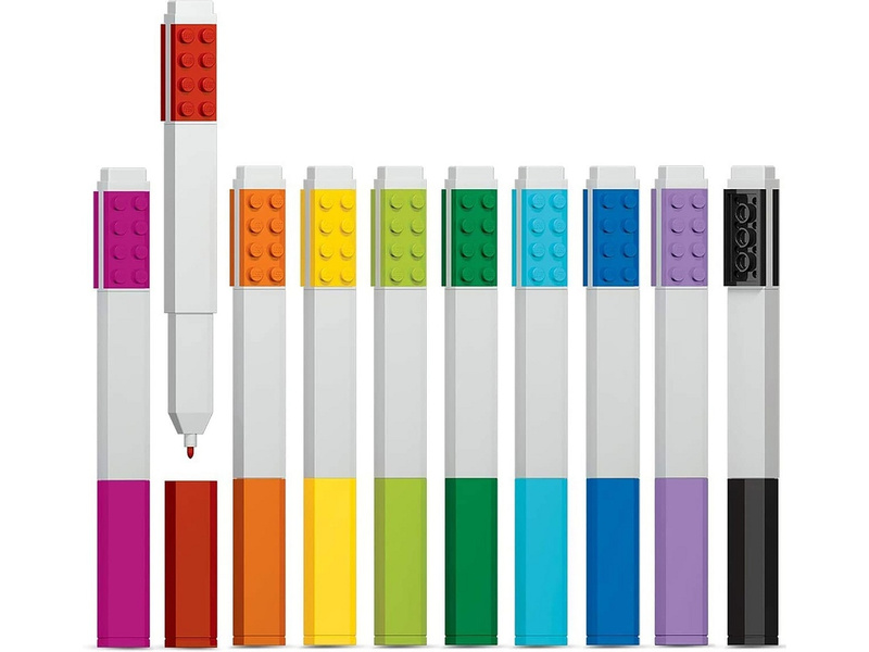 LEGO fixy různých barev (mix 10 barev). Součástí fixů jsou 2 LEGO destičky pro spojení např. s LEGO pouzdrem, minifigurkou, jiným perem nebo k nacvaknutí na LEGO pravítko.