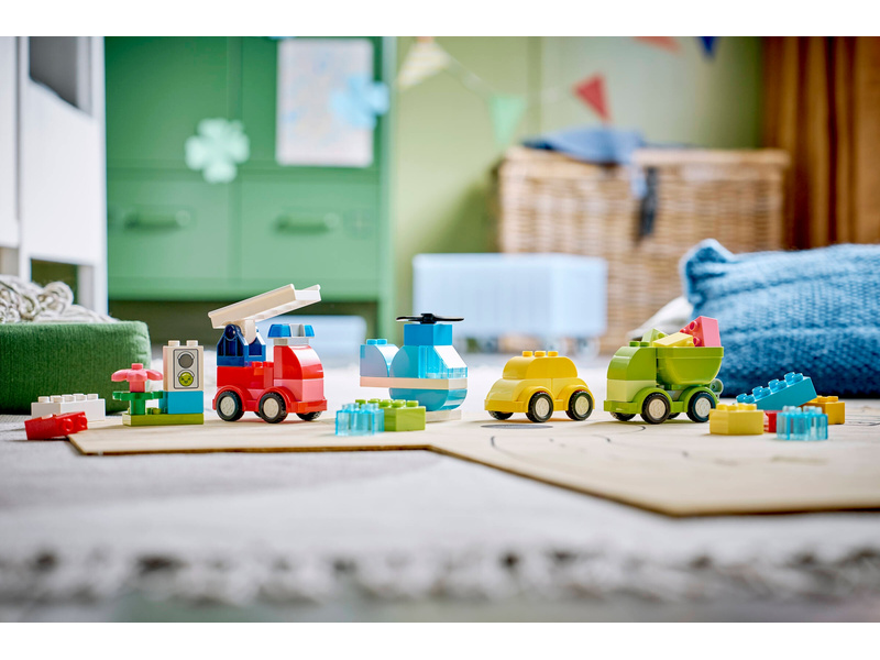 Hračka LEGO® DUPLO® Moje první Kreativní vozidla (10474) batolatům otevírá svět kreativního a neomezeného hraní. Tato vzdělávací hračka pro děti od 18 měsíců obsahuje spoustu kostek, dílků a pohyblivých funkcí, které nastartují dětskou kreativitu! Nejprve si sestaví hlavní modely vrtulníku LEGO DUPLO s otáčející se vrtulí, náklaďáku se sklápěcí korbou, hasičského auta s výklopným žebříkem a malého rodinného auta. Při rozebírání těchto hraček z kostek následně procvičí jemnou motoriku a koordinaci rukou a očí, a nakonec přidají špetku kreativity a další kostky k vytvoření zcela nových modelů.
