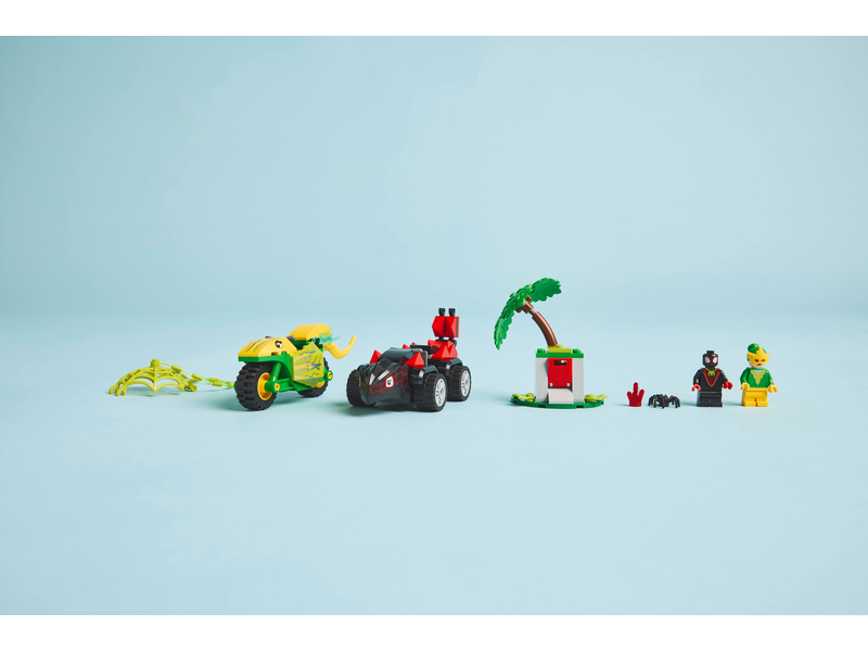 Stavebnice ztvárňuje akční scény ze série „Dino-Webs“ z televizního seriálu Spidey a jeho úžasní přátelé. Obsahuje 2 minifigurky superhrdinů a 2 tahací dinosauří vozidla: Milese „Spin“ Moralese v autě se stegosaurem a Electro na motorce s dilophosaurem. Velká pavučina, krystal ukrytý v kameni a doplňky terénu inspirují děti ke kreativnímu hraní. Uvnitř krabice najdete sáčky, které obsahují kostky a velkou začátečnickou kostku pro rychlé sestavení modelu a postavy, takže děti se můžou hned pustit do hraní. Nechybí intuitivní návod ve podobě barevného obrázkového příběhu.
