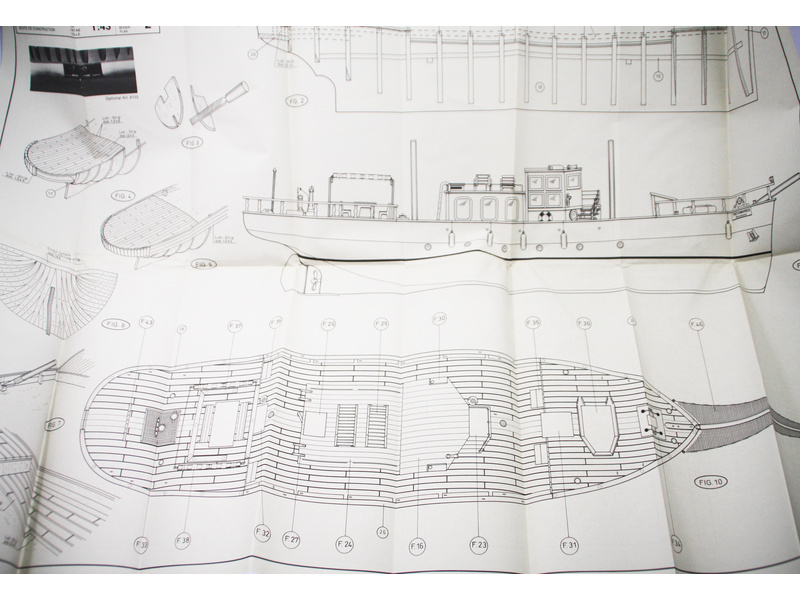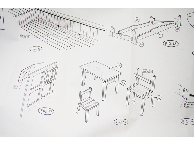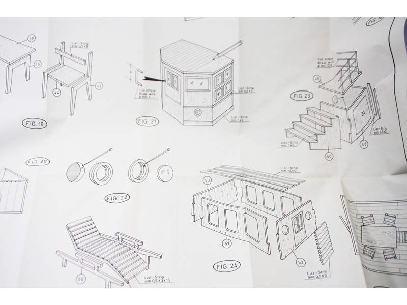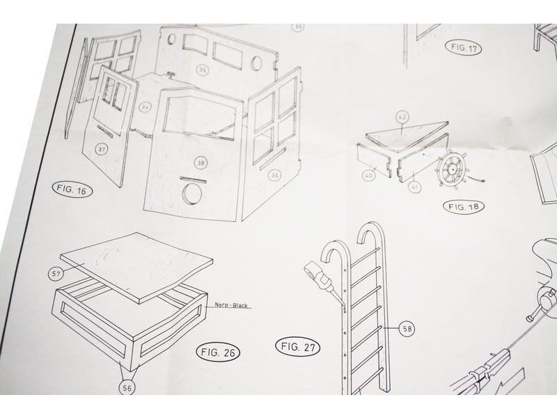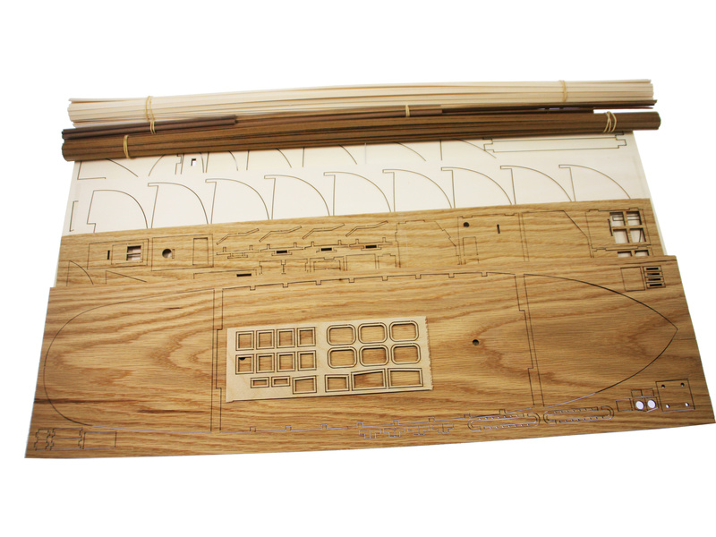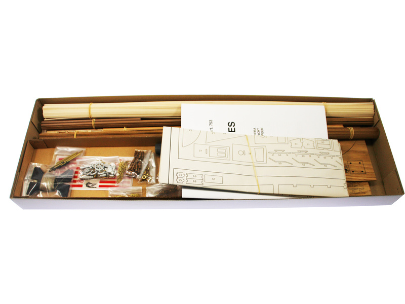 Balení obsahuje laserem řezané dřevěné díly, plaňky, stožáry, kovové a dřevěné kování. Stavební plány, vícejazyčný návod.