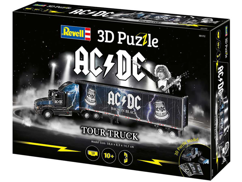 Prostorové 3D Puzzle Revell 00172 – AC/DC Tour Truck. Stavebnice má 128 dílků, výsledné rozměry modelu jsou 566 x 83 x 141 mm.
