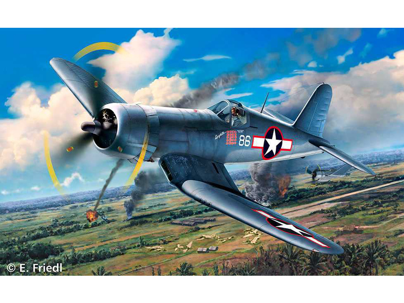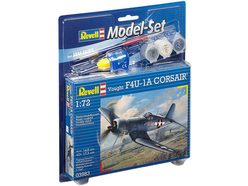 Plastikový model Revell 63983 - americké stíhací letadlo F4U-1A Corsair v měřítku 1:72 ke slepení. Stavebnice obsahuje 63 dílků, rozpětí křídel 173 mm, obtížnost 3.