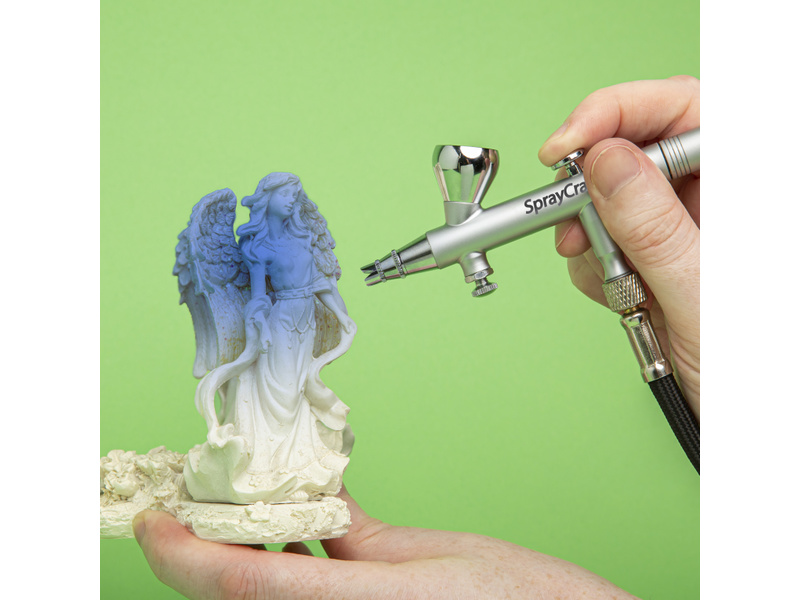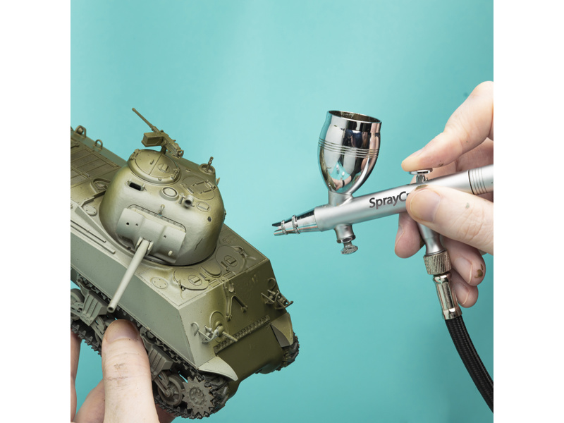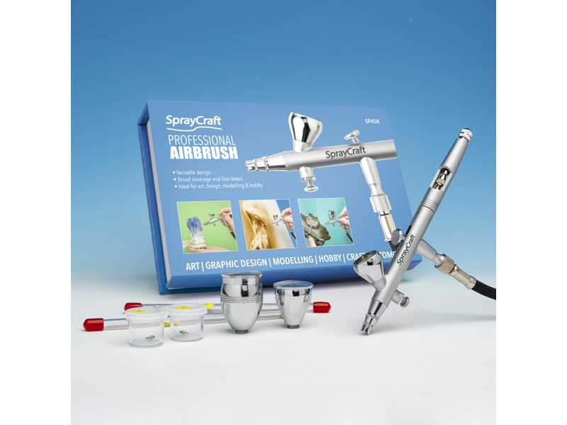 Spraycraft airbrush profesionální dvoučinná stříkací pistole SP45, kdy se stiskem spouště uvolní vzduch a zpětným pohybem se uvolní barva. Trojice výměnných nádobek (2 ccm, 7 ccm a 12 ccm) s vrchním plněním barvy, 3 sady trysek (0,2 mm, 0,3 mm a 0,5 mm). Pistole dále obsahuje šroub pro doladění proudu vzduchu a šroub pro omezení maximálního množství dávkované barvy. Pro profesionály Art, umění a grafiku. Závit pro šroubení hadice se závitem G1/8". Vynikající pro velmi jemné detaily, vyvážené tělo pistole, dobře se drží.
