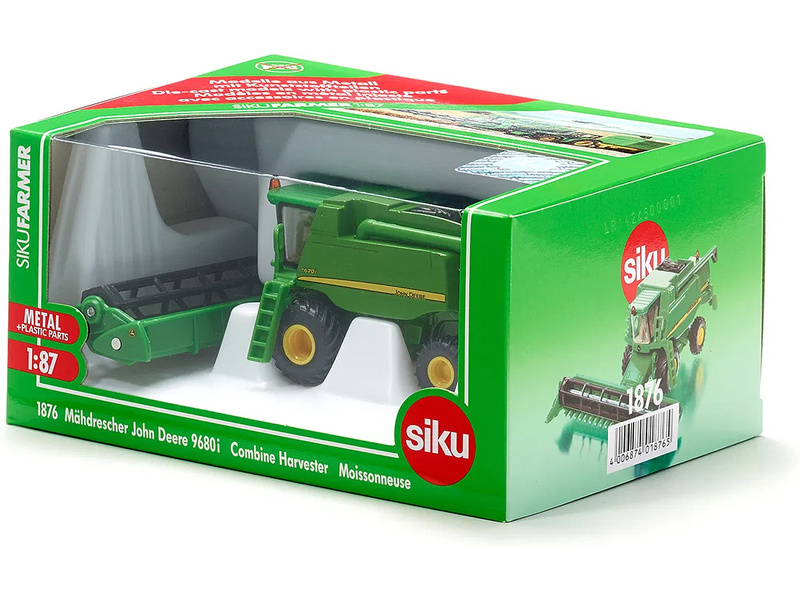 Kovový model žacího stroje John Deere 8500i v měřítku 1:87 od značky Siku. Model má gumové pneumatiky, přední sklopnou žací lištu na kukuřici lze vyjmout, vyprazdňovací rameno je otočné. Vhodné pro hraní i sběratelství. Kvalitní zpracování z kovu a plastu.
