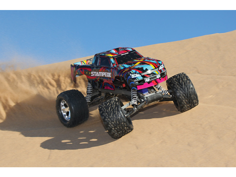 RC model auta Stampede v měřítku 1:10, typu Monster Truck. Pohání jej výkonný střídavý motor s regulátorem BL-2S. Model jezdí až 64 km/h! Obsahuje bezsponkovou karoserii, komponenty pro vysokou odolnost - Extreme Heavy Duty a náhon 2WD. RC souprava TQ 2.4 GHz.