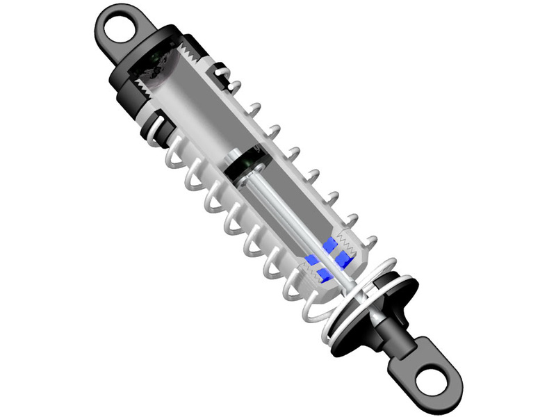 Traxxas hliníkový tlumič Big Bore long v dlouhém provedení bez pružin. Na vnitřní straně povlakovaný teflonem (PTFE). Pístnice jsou ocelové s povlakem nitridem titanu (TiN).