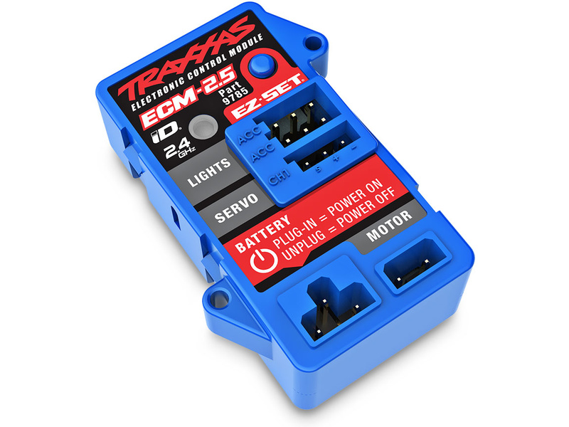 Řídící jednotka Traxxas ECM-2.5 v sobě integruje regulátor i s přijímače. Elektronika je chráněna ve voděodolné* krabičce. Obsaženy jsou funkce: LVD – ochrana proti podvybití LiPo akumulátoru, snadné nastavení jedním tlačítkem EZ-Set a 3 speciální jízdní režimy.
