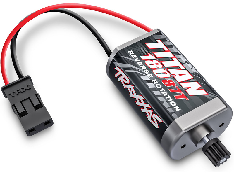 Stejnosměrný motor Titan velikosti 180, 87T (závitů) s pastorkem 11T. Konektor pro zapojení do řídící jednotky Traxxas ECM-2.5.