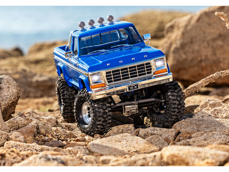 Traxxas karosérie Ford F-150 1979 modrá, pro RC model auta TRX-4M s delším rozvorem 162 mm (High Trail). Bez-sponková karoserie v měřítku 1:18 z ABS, kompletní, včetně mřížky chladiče, zrcátek, klik dveří, ochranného rámu, stěračů, bočních lišt a dalších detailů.