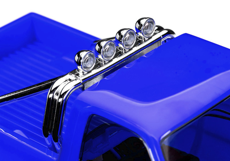 Traxxas karosérie Ford F-150 1979 modrá, pro RC model auta TRX-4M s delším rozvorem 162 mm (High Trail). Bez-sponková karoserie v měřítku 1:18 z ABS, kompletní, včetně mřížky chladiče, zrcátek, klik dveří, ochranného rámu, stěračů, bočních lišt a dalších detailů.