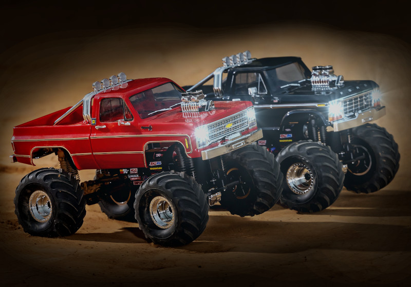 RC model auta Traxxas TRX-4MT Chevrolet K10 v edici Monster Truck s vyšší světlou výškou, obřími koly, úžasnou všestranností a schopnostmi. 4-bodové zavěšení, dvojité olejové tlumiče, kovové převody serva, úhel zatáčení 45°, bez-sponková karoserie, LED světlomety. Baterie 2S LiPo a USB nabíječ.