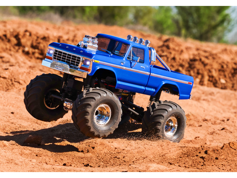 RC model auta Traxxas TRX-4M Ford F-150 1979 v edici High Trail s vyšší světlou výškou, většími koly, úžasnou všestranností a schopnostmi. Kovový podvozek, 4-bodové zavěšení, olejové tlumiče, úhel zatáčení 45°, bez-sponková karoserie, přední LED světlomety. Baterie 2S LiPo a USB nabíječ.