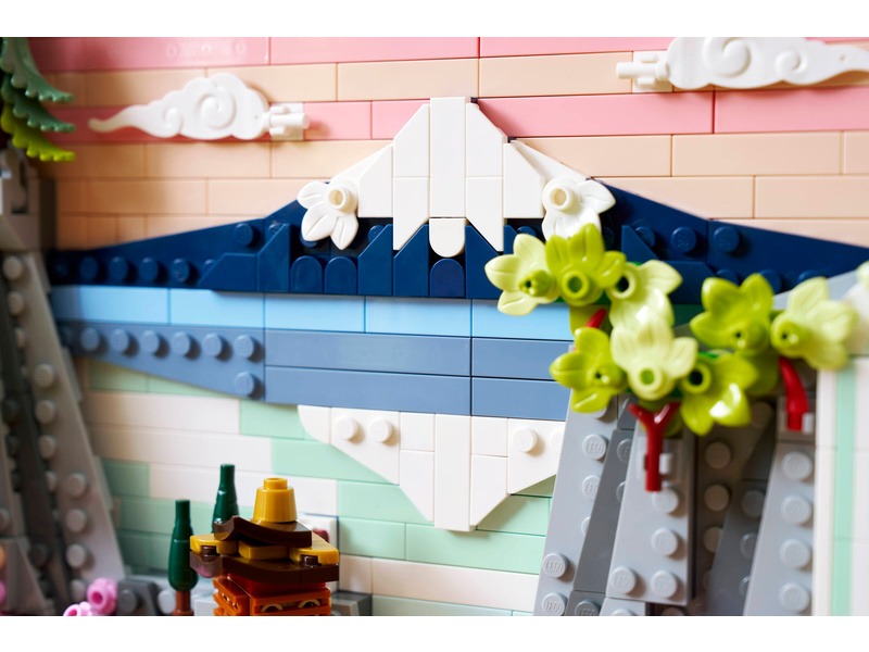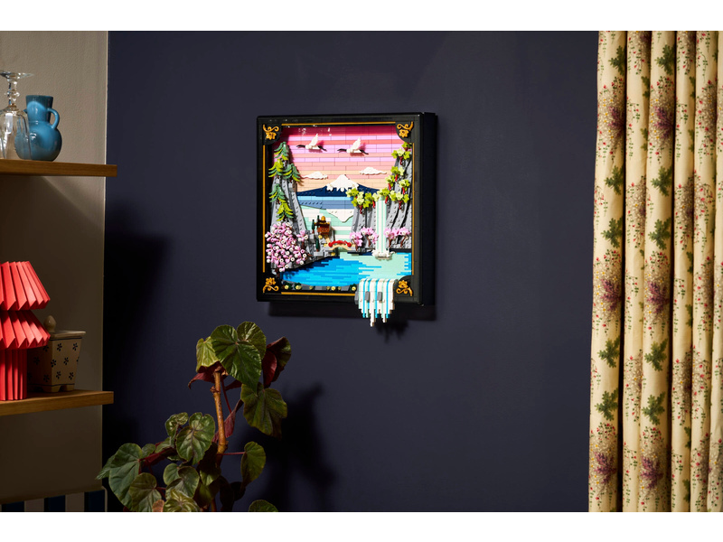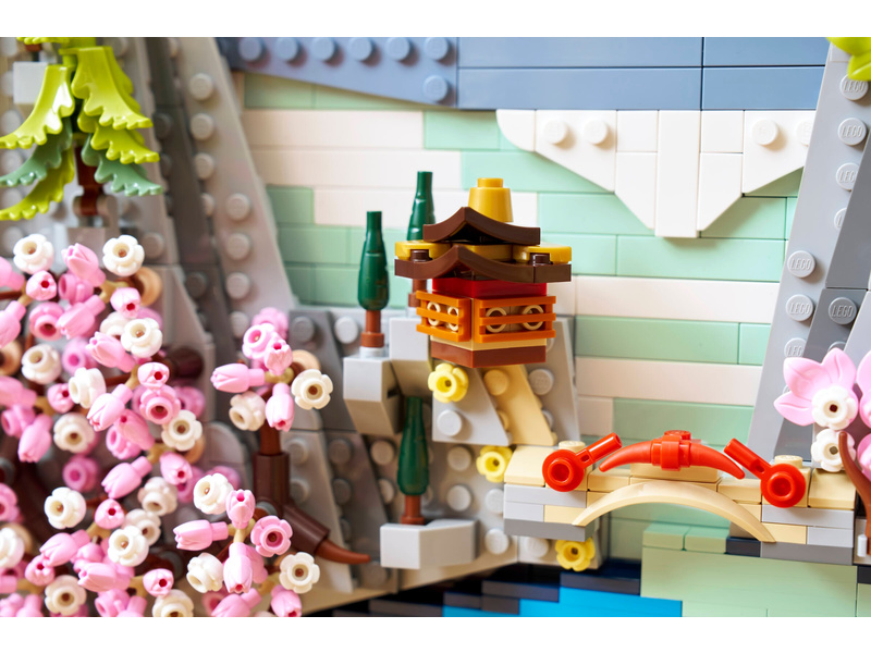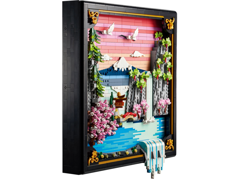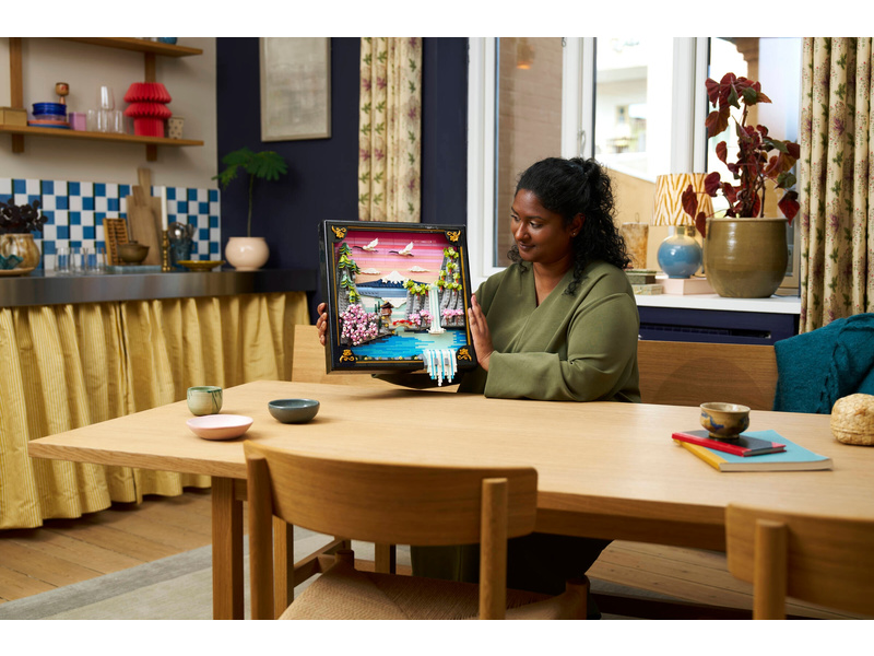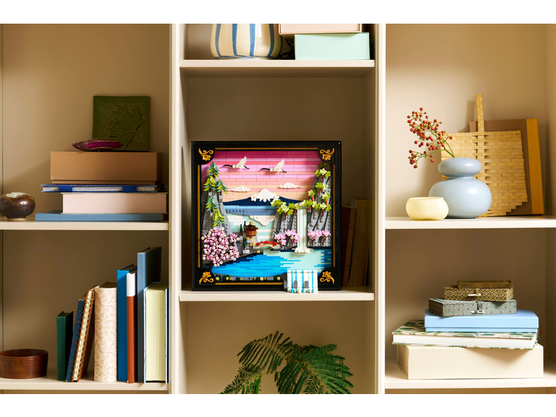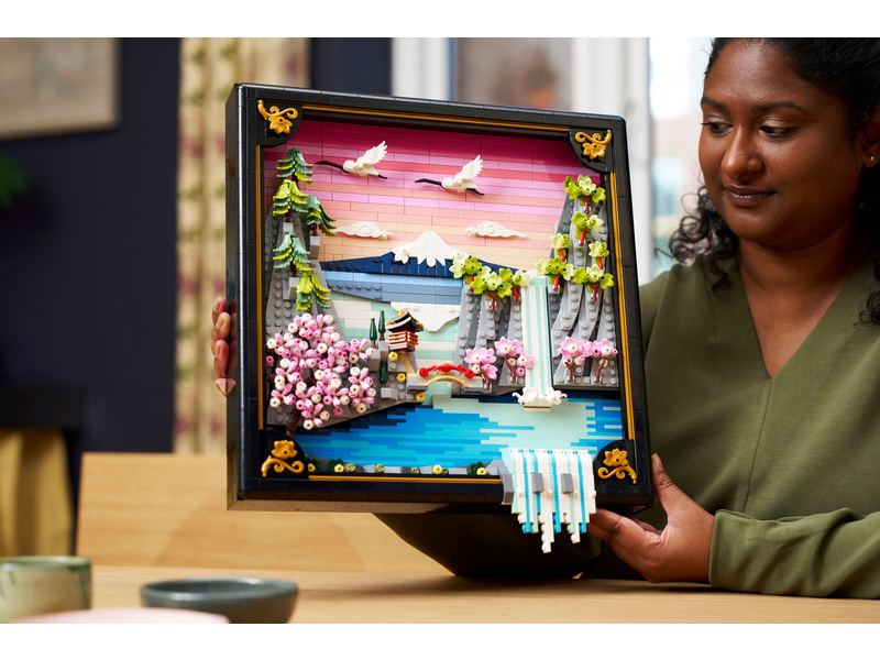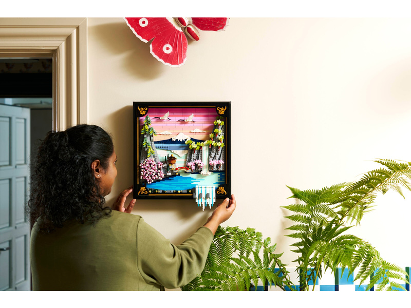 Bring color and nature into your home with this LEGO® Art Japanese Cherry Blossom Landscape (31218) building set for adults. Inspired by the beauty of springtime in Japan and the country’s Ukiyo-e artists, this stunning brick-built 3D wall art features Mount Fuji, a teahouse, a bridge, a waterfall, flying Japanese cranes, and cherry blossom, ’Sango-Kaku’ maple and Japanese umbrella pine trees. This aesthetic room decor comes in a black lacquer shadow box frame and has 2 display options. It can be mounted on a wall with a hanger or freely stood on a flat surface. The artwork’s waterfall flows beyond the frame so on a wall it pours directly out, or it can be adjusted to spill out onto a flat surface. This LEGO art set offers a calm, immersive and mindful experience for adults as you build the botanical wall art from LEGO bricks. A treat for yourself or a Japanese gift idea for art lovers, this model includes instructions to guide you through a creative activity. Set contains 1,892 pieces.