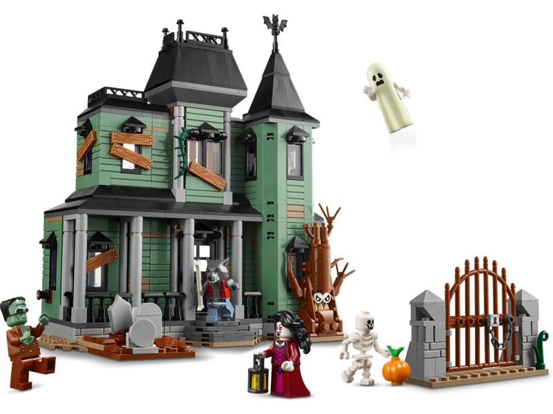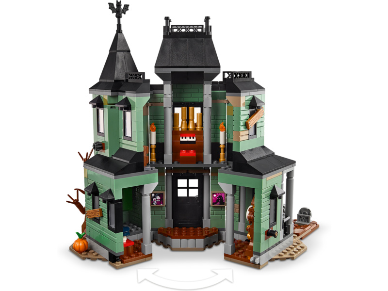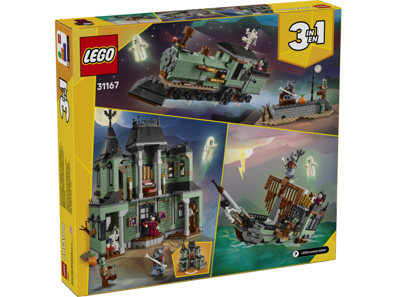 Play out scary stories with the LEGO® Creator 3in1 Haunted Mansion (31167) house building toy. The 2-story haunted house is packed with cool details and features, including an opening front gate, a graveyard, a detachable scary tree, an organ, a hidden ghost revealed by turning a wheel, and an opening back for more play value.