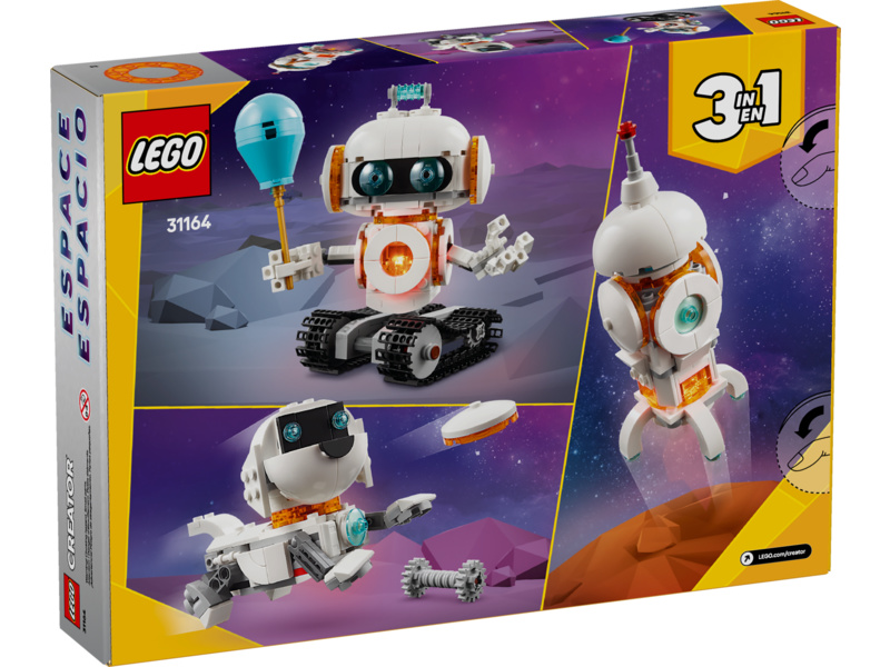 Boys and girls aged 8 plus play out stories among the stars with this LEGO® Creator 3in1 Space Robot (31164) science playset. This robot toy for kids is set on moving tracks and features a jetpack, a body and head that can spin around, posable arms and fingers, a balloon, and a light brick that illuminates its chest.