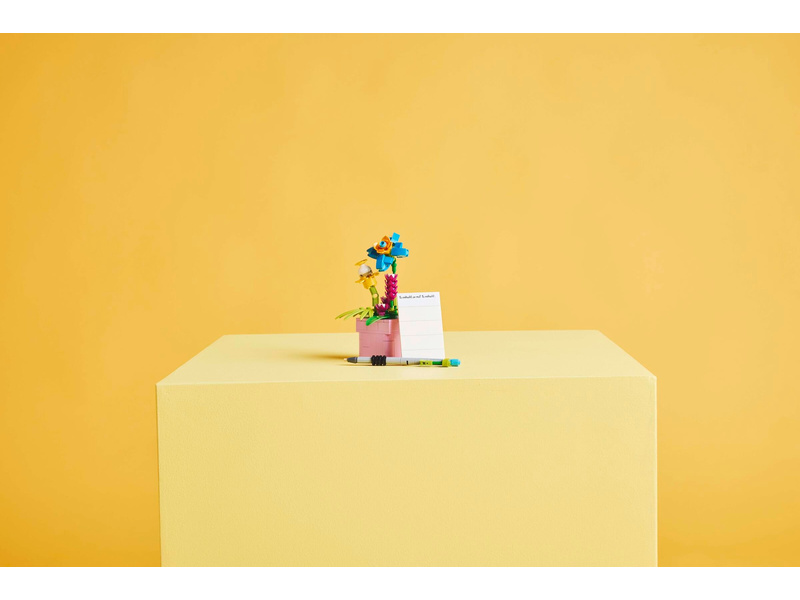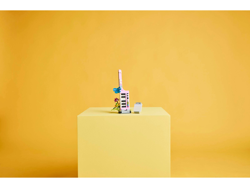 LEGO fans have a choice of 3 different flower kits to build: a Typewriter with Flowers toy; a keytar toy instrument on a stand with flowers; or a flowerpot with a pen and notebook. The rebuildable toy playset also comes with 3 stickers featuring thoughtful phrases, which kids can use to decorate the brick-built models.