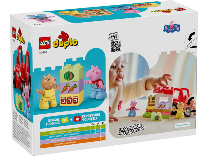 Help toddlers cultivate their creativity with the Peppa Pig Tractor and Market (10468) building toy. Toddlers ages 2 years old and up immerse themselves in imaginative play as they imitate running a farm store and stocking it with the LEGO® DUPLO®bricks decorated with food items to sell. This pretend play toy comes with Pedro Pony and Peppa Pig figures, a drivable red tractor and carrot, watermelon and jam jar bricks. This toddler learning toy comes with lots of development opportunities. By ob serving and imitating scenes from the show, they can sharpen cognitive skills, such as problem-solving and memory. Little builders use their fine motor skills to assemble the tractor and build the stall. The set features a menu decorated with a watermelon, carrots and jam jars. Toddlers can practice number recognition and matching to find the corresponding decorated brick. Contains 18 pieces.