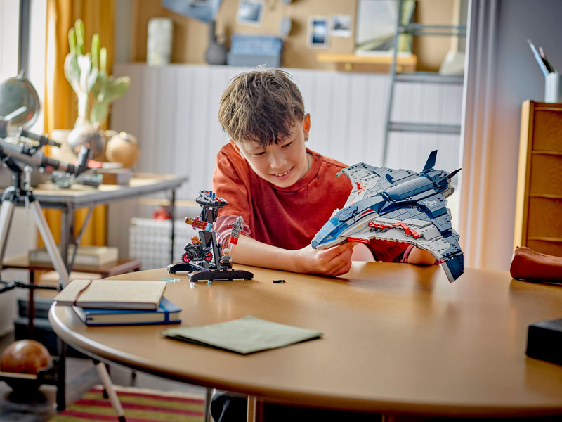 The buildable Quinjet model comes with 5 minifigures: Black Widow with her motorcycle; Iron Man; Quicksilver; Ultimate Ultron; and Hawkeye with his bow and arrow. The minifigures can be attached to multiple locations on the aircraft. The Quinjet features an opening cockpit, 2 stud shooters at the front, and storage for Black Widow’s weapons and Hawkeye's bow. The rear door opens so kids can drive the motorcycle in and out. A removable, rotatable stand is included to provide a 360-degree display of the iconic aircraft. For added digital fun, builders can zoom in, rotate models in 3D and track their progress using the fun, intuitive LEGO Builder app. Contains 1,131 pieces.
