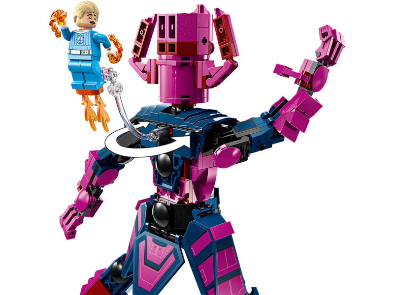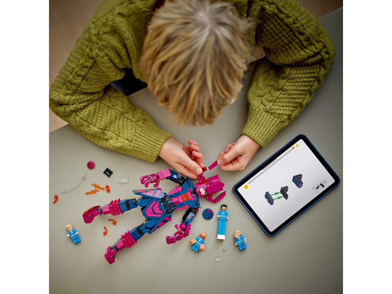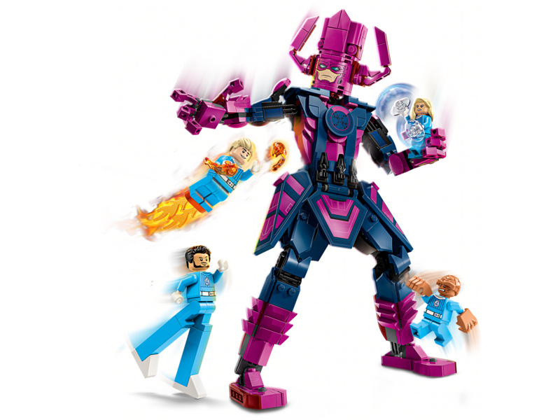 The buildable LEGO ǀ Marvel Fantastic Four toy includes 4 minifigures: Mr. Fantastic, featuring extendable legs; Human Torch, with 2 hand blasters and flame elements attached to his feet, plus a transparent support that enables him to ‘fly’; Invisible Woman holding 2 force shields; and The Thing with his large, powerful hands. A fully jointed construction figure of the film’s iconic villain, Galactus, stands over 28 cm (11 in.) tall. This posable construction figure prompts endless action as he battles the Super Heroes. For added digital fun, builders can zoom in, rotate models in 3D and track progress using the fun, intuitive LEGO Builder app. Set contains 427 pieces.