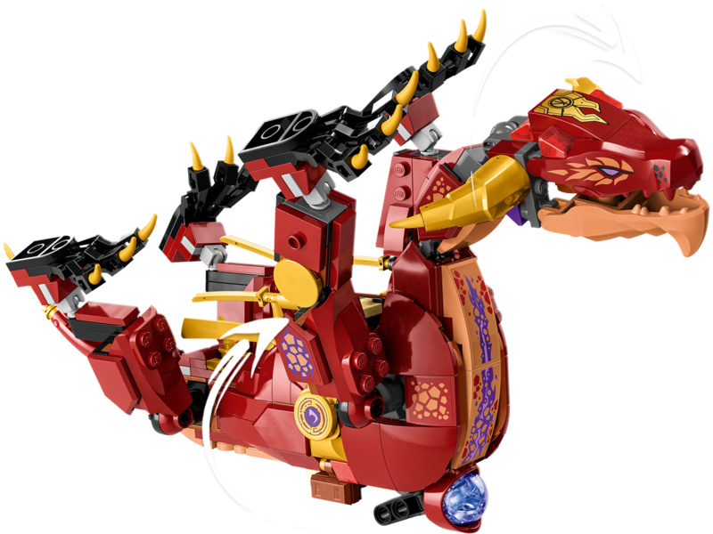Ninja fans aged 8+ can recreate their favorite scenes from the NINJAGO® Dragons Rising TV series with this Heatwave Transforming Lava Dragon (71793) playset. It features a never-before-seen dragon that kids can play with in 2 modes. In peaceful mode it stands majestically but when flipped upside down it switches to battle mode, which allows it to fire out a purple dragon power element from its chest.
