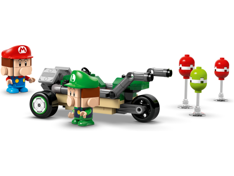 Bring on the balloon-busting and racing action with this Baby Mario vs. Baby Luigi toy playset for kids (72034). An exciting Mario Kart™ birthday gift idea for boys, girls and gamers aged 8 and up, the set features 2 collectible Nintendo® figures – Baby Mario and Baby Luigi – and their Biddybuggy and Tri-Speeder toy vehicles. Each buildable car can launch shells, and there are 6 buildable balloons (3 red, 3 green) to aim at. Who will knock over their balloons first?